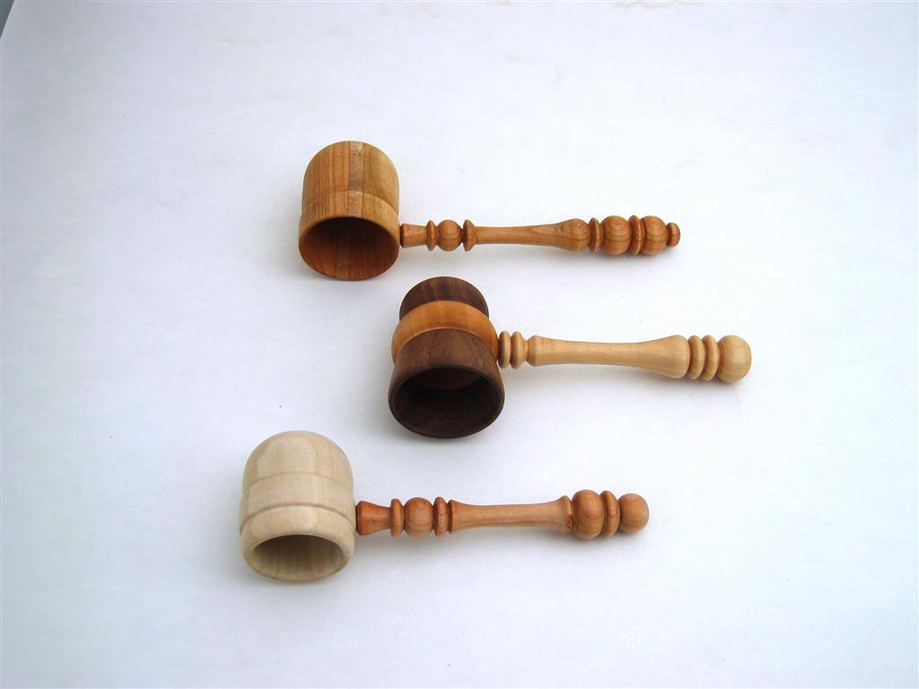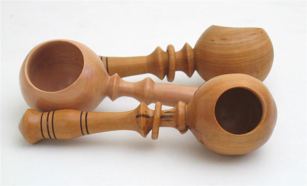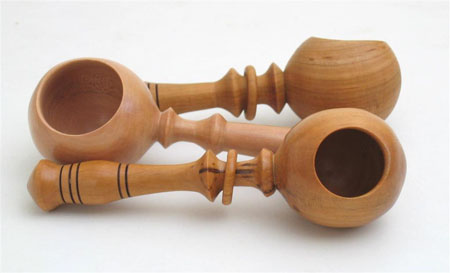 These are fun to make and give away. Some have a captive ring. The scoop portion has an inside diameter of about 1 5/8". I use a donut chuck to hold these to hollow them out after turning the ball and handle.