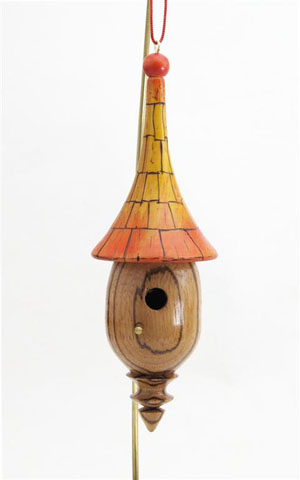 Body of zebra wood and roof of Bradford Pear with burned shingles and dyed yellow and red. Perch is brass. Made for Chattahoochee Woodturners 2011 ornament exchange.