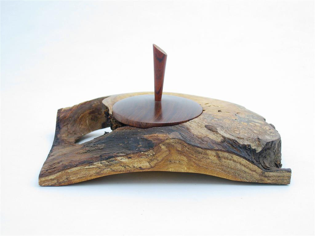 This was made from a scrap of sassafras burl given to me when I made a shop visit to a fellow AAW turner near my home town. The body is about 2" X 4" X 6" with a walnut lid with a handle of cocobolo. I could not make it any thinner because of the shape. The void was from a bark inclusion that went all the way through and flew off while I was turning. It is finished with urethane oil.