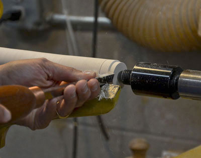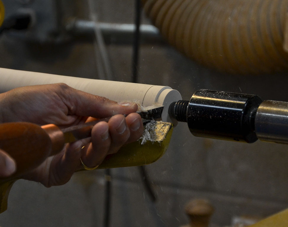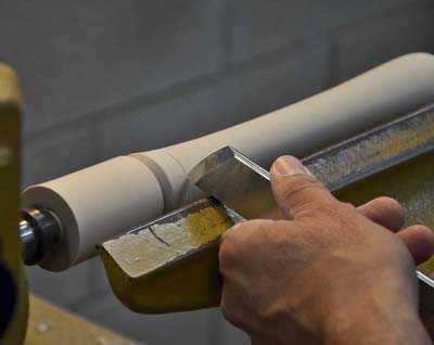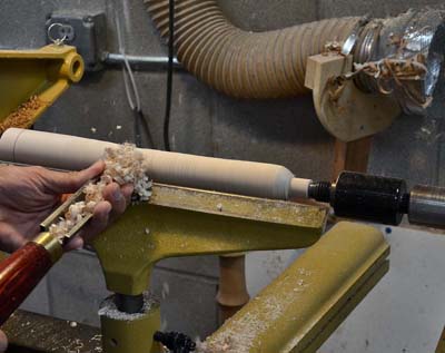 Next, I mounted a blank between centers and turned it round. In this case, I turned the blank down to approximately 1-1/2" diameter. I used a spindle roughing gouge and a skew for the bulk of the work at this stage.