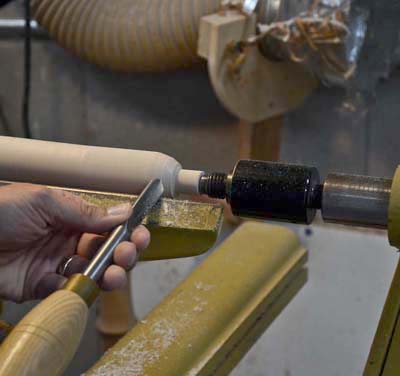 I opted to position the tenon at the tail stock end of the lathe. This placed the heavier mass of the blank at the head stock end. In addition, this allowed me to turn the tenon down to 5/8" and still have support from the live center.