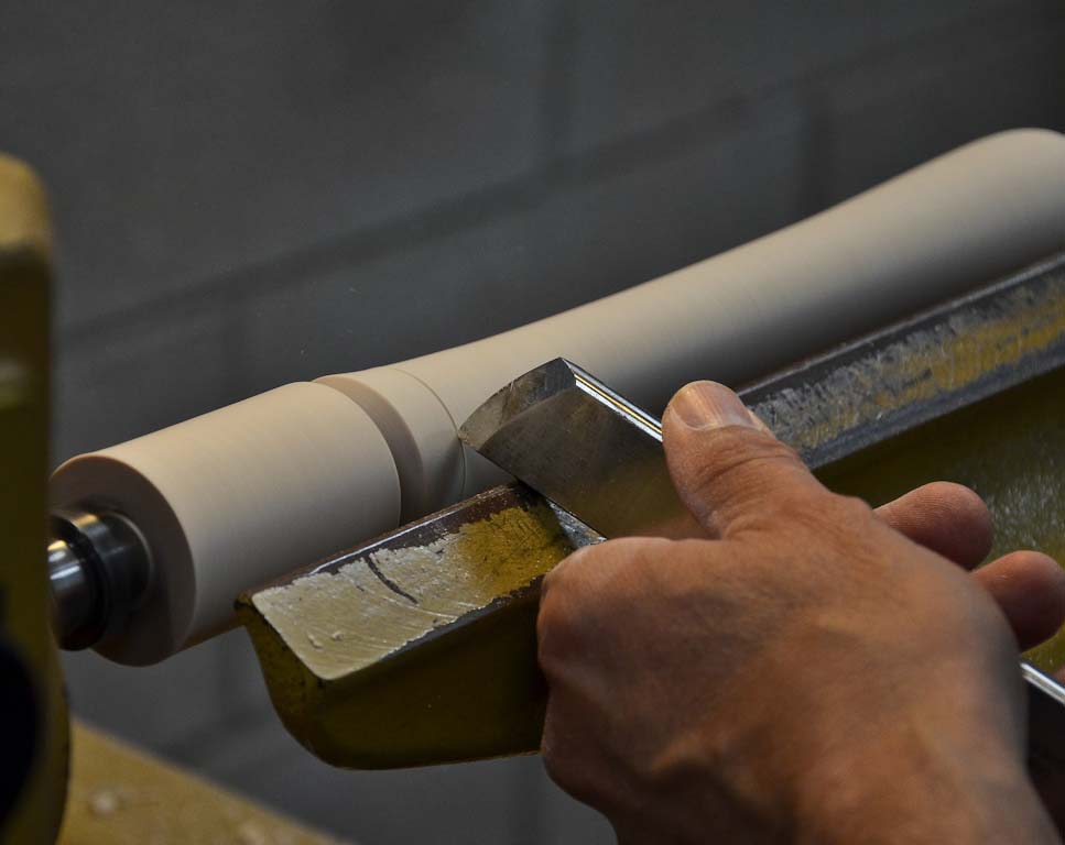 Next, I begin shaping the handle to the profile I prefer. My goal at this stage is to shape a handle that feels comfortable in my hand. I used a spindle roughing gouge and skew to shape this stage of the handle. I also used a spindle gouge to shape the large diameter of the handle where it transitions to the tenon. I made this large curve terminate just above where the copper ferrule butts into the shoulder of the tenon. Remember to test the feel of the handle as you go. This helps you find the bumps and dips that may not be visible by eye.