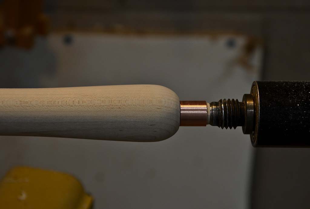 I begin by marking out for the length of the copper ferrule. I recommend that the tenon be just about 1/8" longer than the length of the ferrule. I think it is easier to remove the excess tenon than it is to reshape the entire handle if your tenon is too short. This excess can be sanded away later. I used a large parting tool to remove most of the tenon, still leaving it oversized at this stage. Defining the tenon allowed me to have a clear view of this transition.