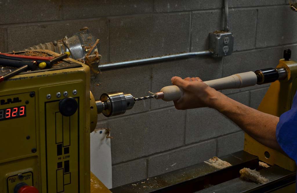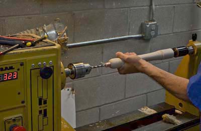 Next, I mounted a drill chuck with a 1/4" drill bit into the head stock, and reverse mounted the handle. The point from the drive center was used to locate the end of the handle into the live center. The drill bit was centered into the point left by the live center. I then locked the tail stock, set the lathe to slow speed (sub-325 rpm), held the handle, and used the quill advance wheel to push the handle onto the drill bit. I drilled approximately a 4" deep hole into the handle. This operation could also be completed on a drill press. However, I personally find it much easier to accomplish this task on the lathe.