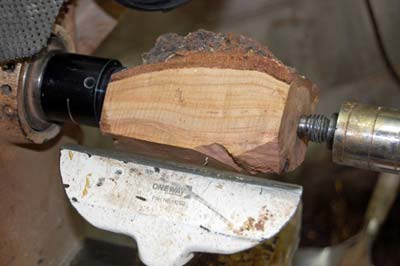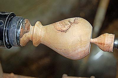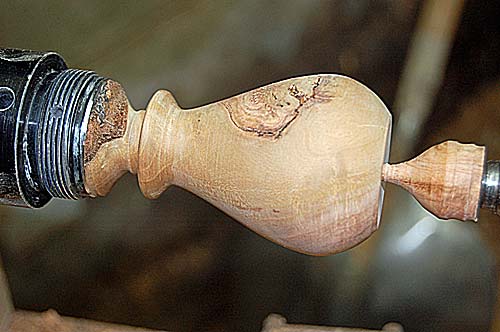 I drill a 1/4" hole and mount it on my chuck. I round it and shape it. I then sand and finish it on the lathe and then take it off the chuck.