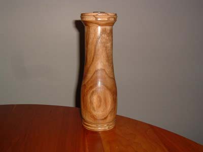 These are a couple of my very first tunings. I'm self taught and an avid reader of turning books of the masters. The two pieces shown above are 3 1/2" x 11 and 4 x 12" tall, and I believe the wood is elm (it was from an estate sale, so it's a guess). Note the larger has a glass tube inserted to hold the flowers up. They are finished in Danish oil and then waxed.