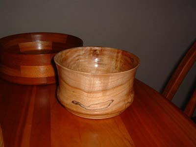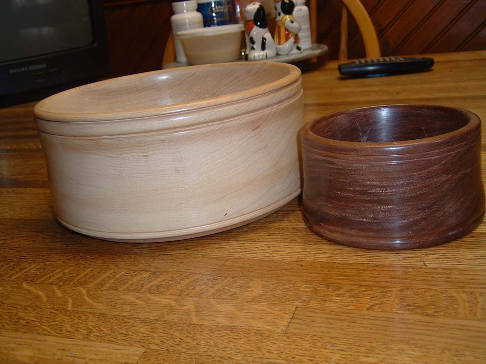 These are the very first and second bowls I ever turned. One is basswood, the other walnut (note how pic shows it could have been smoother).