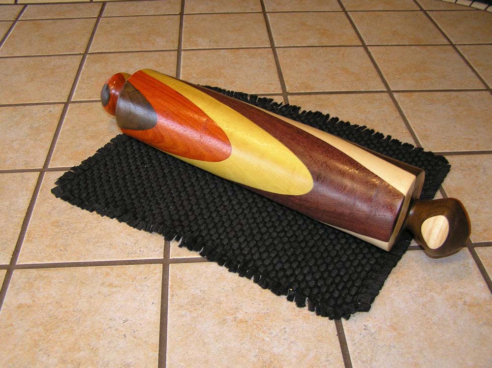 This rolling pin is made from Purpleheart, Yellowheart, African Padauk, Wenge and Hard Maple.