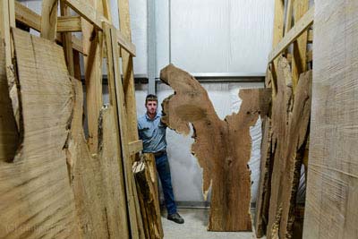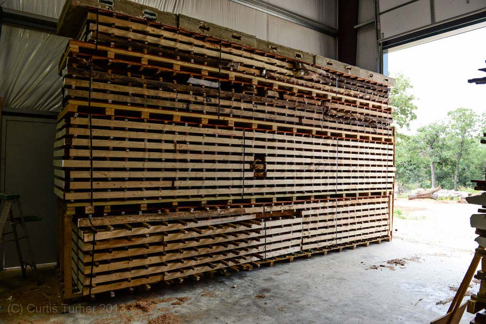 Brandon has developed several unique machines that allow him to joint and plane massive slabs of up to 100" wide. The jointer planer machine is capable of processing monster slabs into flat smooth slabs. The flatness is 30 thousands of an inch over the length. This is a remarkable capability among the extreme lumber providers. The proprietary process he has developed is such that I was not permitted to photograph the machines and processes. It was quite an impressive set up. Not only is this a gigantic jointer/planer it is much quieter than my 13" power planer! Brandon also had custom computer software developed to precisely control the kiln drying process. The mill offers both kiln-dried and airdried wood.