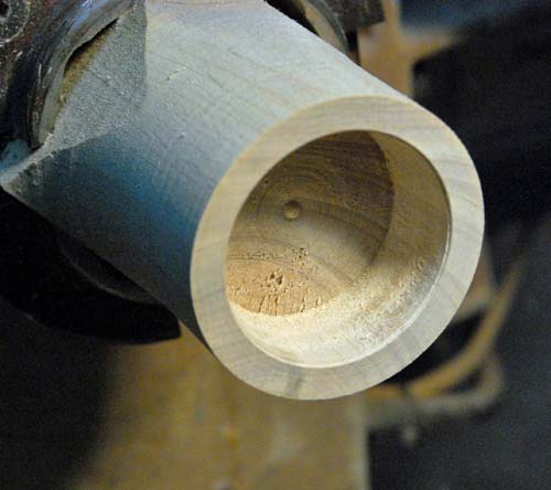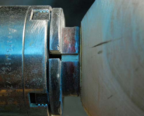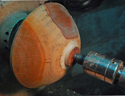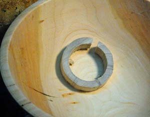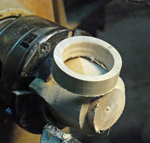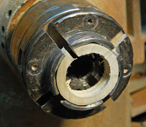 Hollow the piece of wood from the marks you have transferred. Make it deep enough so it will stick out of the jaws. Go to the bandsaw and cut about a half inch slot in the side of the donut you have just made. If you made the hole a little to big, cut the slot larger. Insert it into the jaws and try the tenon. Remove the tenon and close down the jaws and face the collet so it is smooth and co-plane to the face of the jaws. Open the jaws of the chuck and put the tenon into the wooden collet and tighten the jaws down tight. Voila! Turn away. When you are finished using the collet, throw it away, you don't need another piece of wood cluttering the shop. Happy turning.