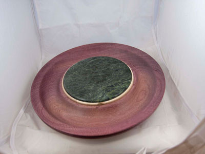 A Cheese & Cracker Platter made from purpleheart with a maple insert around the granite center.