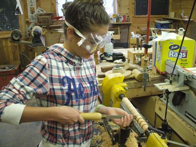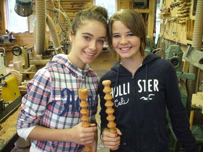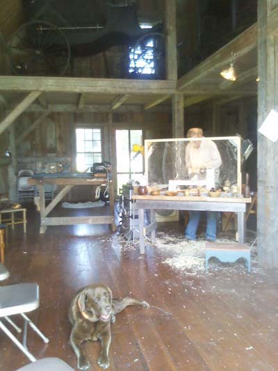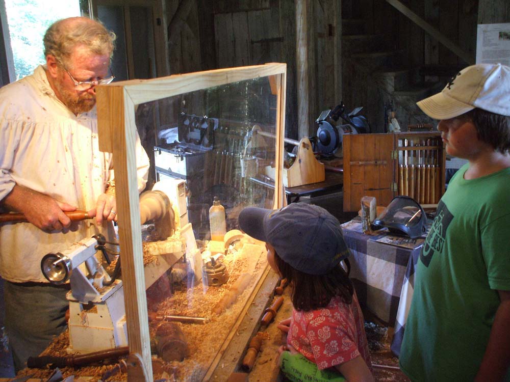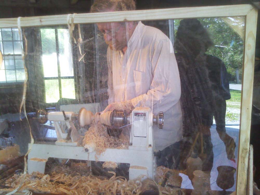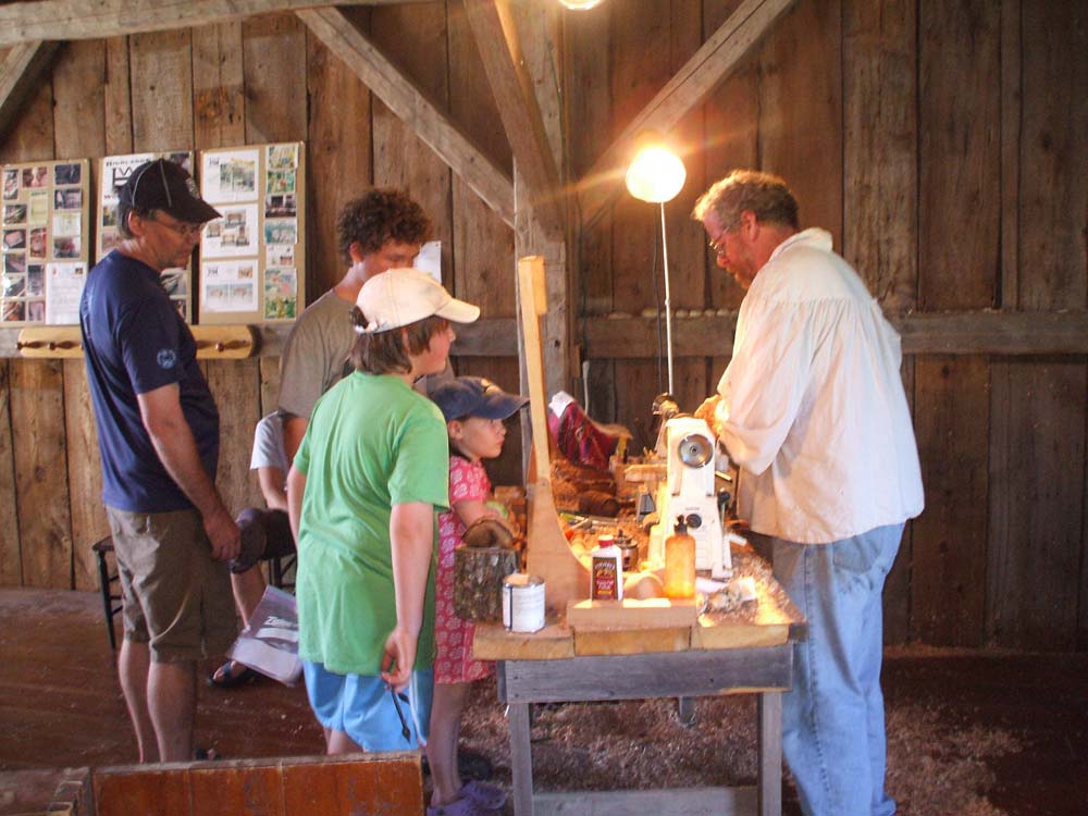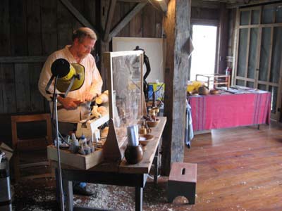 When I moved my shop to Castine, Maine in summer 2009, I was invited to join an existing blacksmith to demonstrate woodturning as part of the "Living History" exhibit. I continue to enjoy demonstrating at the Wilson Museum each Wednesday and Sunday of July and August from 2:00 - 5:00PM and find that regular discipline and interaction with both the casual tourist and the regular summer visiting public challenges me to be inventive, interactive, and responsive. Many of the regular audience members become summer and/or year-round students in my shop, where they enrich my summer demonstrations by their growing expertise. Spinning tops, Harry Potter wands, toadstools, and small bats -- the demonstrators "give-away" collection included a new feature of a woodturned ring & string puzzle in support of the Museum's special featured summer exhibit of beautiful, old, wooden jig-saw puzzles.