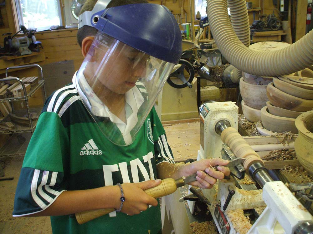 Beyond the kinesthetic thrill of turning a piece of wood at the lathe myself, the experience of demonstrating and teaching woodturning offer the innate reward of watching someone's face light up with delight and understanding as a rough piece of wood becomes round and smooth and shaped deliberately into a useful or at least recognizable object. Children and adults, both experienced and those brand new to woodturning all watch the process in fascination as the flying shavings, practiced movement of the tools, and skillful decisions of the woodturner artist translate visually and quickly into that object. Many turners recognize the child's focused attention -- and emerging "ownership" -- of a turned spinning top with chattered carvings and custom-colored illumination.