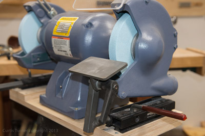 (above) is an alternative to the Vari-Grind. While both jigs will grind the same angles the Vari-Grind 2 offers a level of safety not found on the original Vari-Grind. The Vari-Grind 2 is a captured system that keeps the tool centered on the grinding wheel. This prevents the tool from accidently slipping off the grinding wheel. This jig mounts in the base and not on the Vee-arm, as does the original. The Vari-Grind 2 pivots on a captured point and allows for a more controlled method for grinding complex bevels.