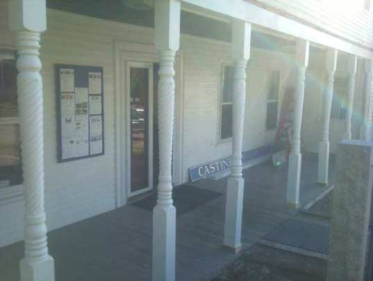 The existing porch posts had deteriorated somewhat over time from the rugged weather blowing into the Castine harbor from Penobscot Bay. The wide spans between the posts allowed the sill for the apartment wall above to sag and droop. Scott's solution/design was to replace the plate above with a steel beam, and to add two additional posts. This allowed him to re-position all of the posts to shorten the distance between posts, while centering the front door to the business offices.