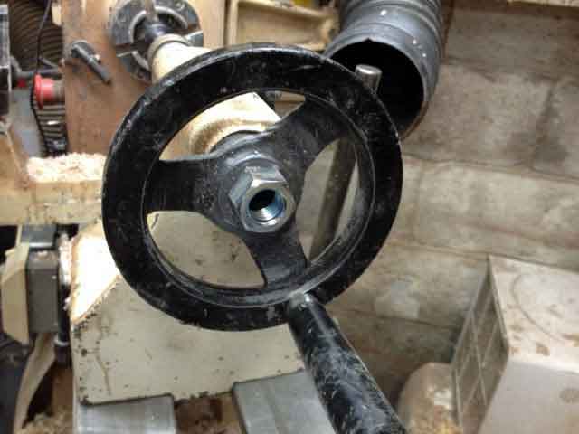 Well I've done it again. I know you thought I was over the top when I used spray foam in my bandsaw, but it worked. Now I have done something to save time. I do a lot of hollowing and drilling on the lathe. No problem advancing the drill bit, but boring and time consuming retracting the tail stock quill. I turn the crank in and out a lot. So, Rich from Newnan, GA was in the store and we got to talking about this problem. He said he put tape on the end of an extension and jammed it in the hole of the quill and retracted it. The tape had to be replaced frequently. So, I thought about a nut. You'd think it was me, but no, a real nut. A 15/16" (outside dimension) nut. I disassembled the crank from the back of the tailstock and mounted it in some pin jaws. I inserted a live center in the quill and moved it up until it centered the hole in the crank. After mixing up a small amount of JB Well, I centered the nut at the end of the crank and glued it. Off to the hardware store to buy an extension for the 15/16" socket I already had. I needed the extension so the handle on the crank would not interfere with the rotation of the nut. Eazypower makes a connector that has a 1/4" drive on one end for the drill and a 3/8" drive to fit the socket extension. Voila! Does it work you ask? Is the pope catholic? YES. So now when I have to drill a lot I can speed up the process by using the updated drill.