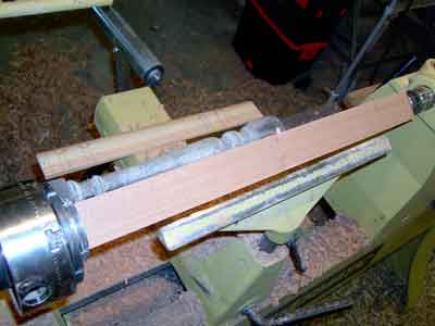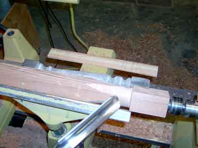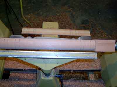 Setting out to turn a series of multiple spindles requires a number of helpful preparations. First, dimension the stock to a common square and length. In the case of this sample of cedar blanks to be turned, the contractor requested extra waste on each end to allow for field cuts in the old house he was restoring. This sample is relatively short at 22" and will not require a steady or special plan. It does, however, have square pommels at each end. The cedar is dry and brittle. One possible way to ensure the edges remain is to use see-through scotch tape, but that may pull the edge off when it is removed. Generally, I find I do not need to tape the pommel because of the excellent cutting characteristics of the well-sharpened skew chisel. With these 2"X2" blanks in this length and to the smallest diameter, a lathe speed of 800 to 1200 is plenty fast. Faster speeds can produce "rippling" that ruins the piece on finish cuts near the end. Smaller diameters over longer lengths turn better at the slower speeds.