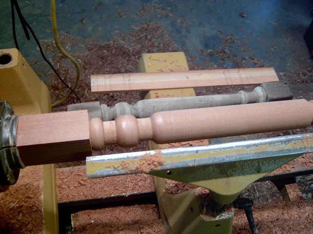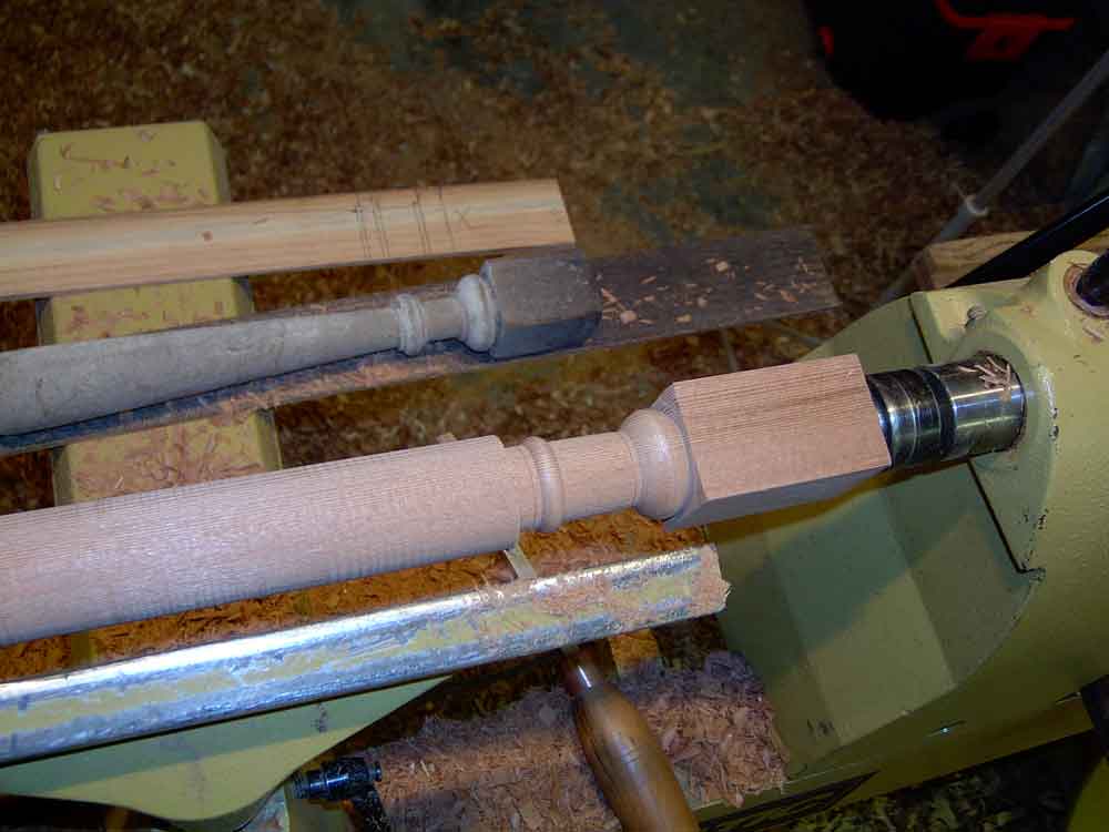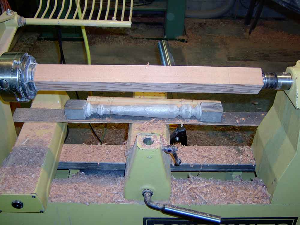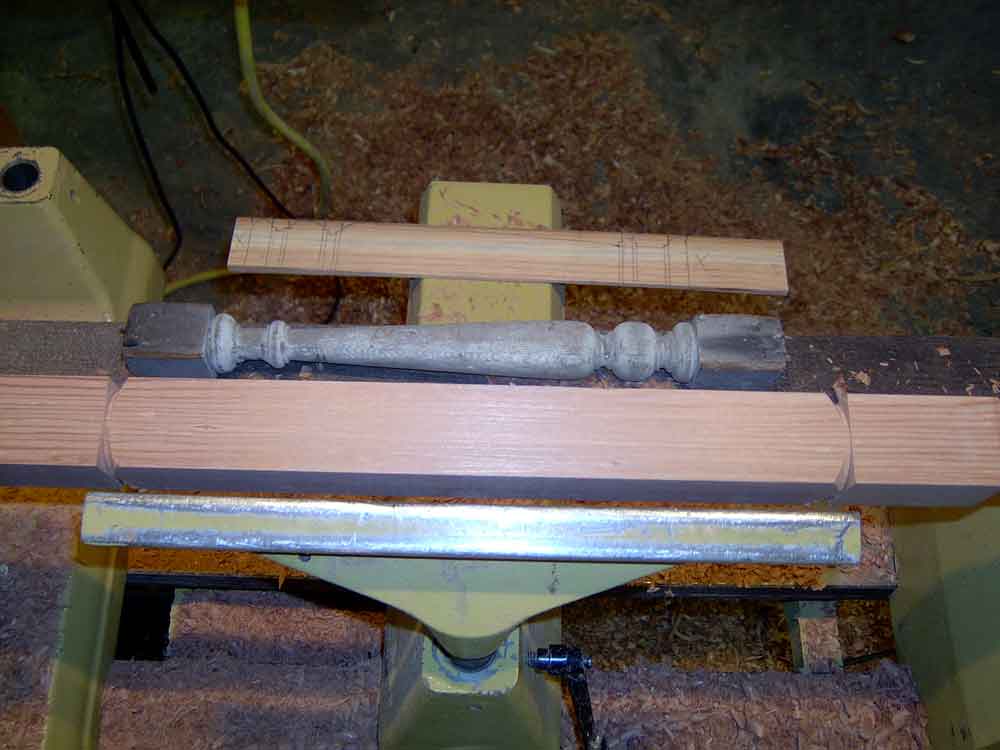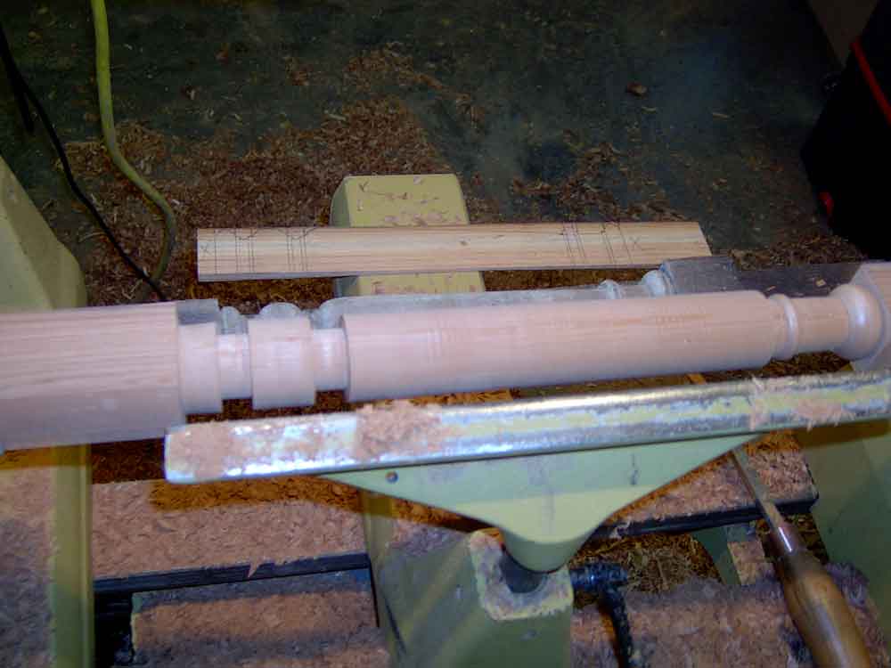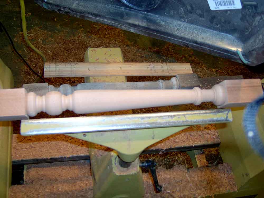 This is also a good time to create a dimensioned "story stick" of thin clean lumber to be used to mark the critical points of the turning details. Note in this photo the story stick, the original turning, and the first two turned copies are on top of the remaining marked blanks. The sharp edges of the beads, coves, and shoulders must line up exactly. Ironically, for many turnings, the diameter does not need to be exact. While calipers can help and the diameters should be in proportion, the actual diameters must only be approximate.