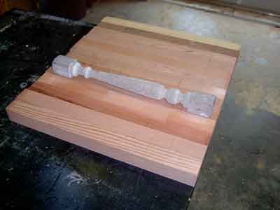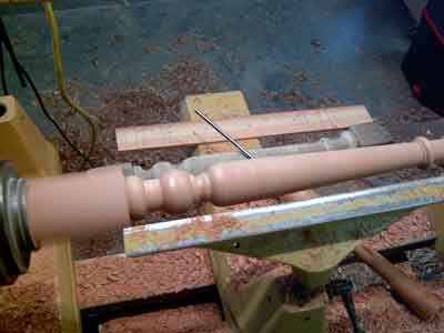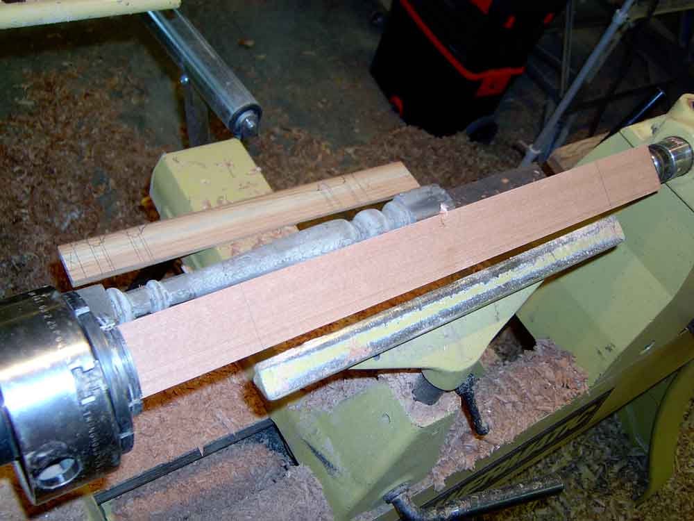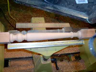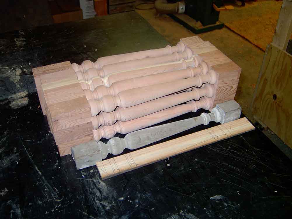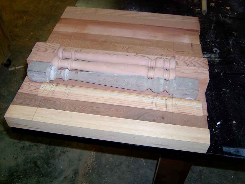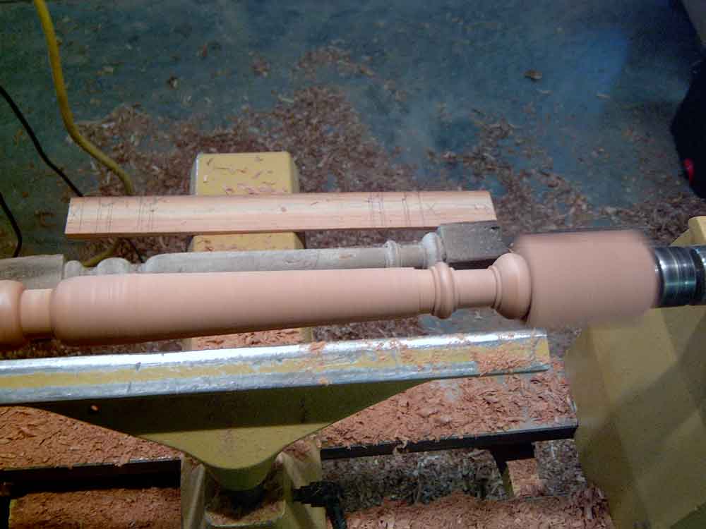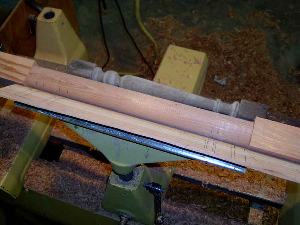 This is also a good time to create a dimensioned "story stick" of thin clean lumber to be used to mark the critical points of the turning details. Note in this photo the story stick, the original turning, and the first two turned copies are on top of the remaining marked blanks. The sharp edges of the beads, coves, and shoulders must line up exactly. Ironically, for many turnings, the diameter does not need to be exact. While calipers can help and the diameters should be in proportion, the actual diameters must only be approximate.