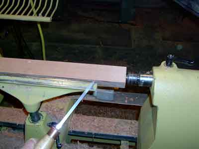 Proceed with a roughing gouge to round the blank between pommels. Work the edges carefully to avoid hitting the pommel edges and splitting them off. Use a sharp chisel with the bevel rubbing (#1).