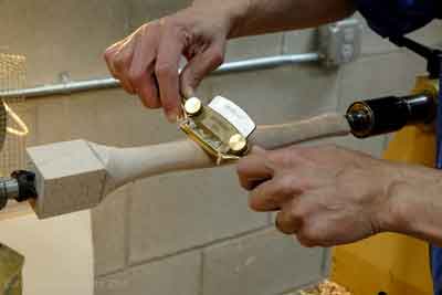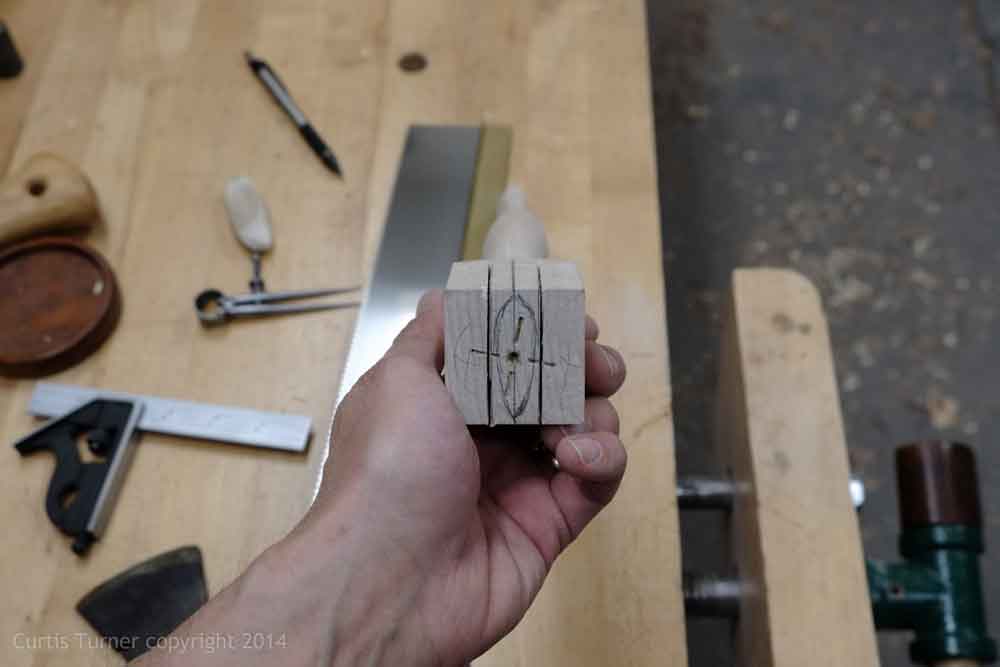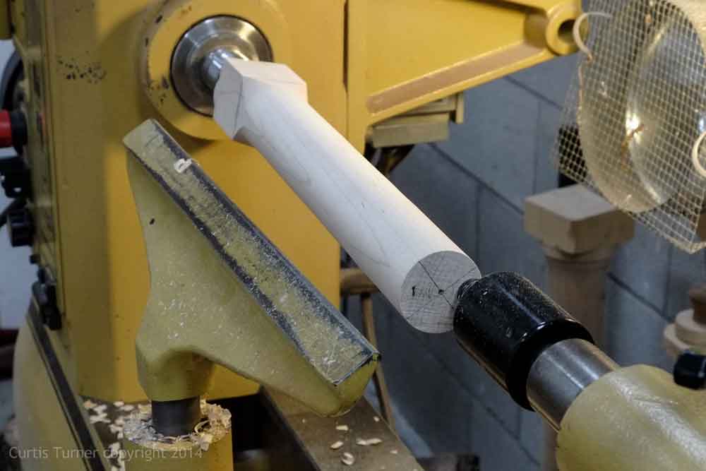 It is important to use stock that is very square because your successful layout will be based on the "squareness" of the stock. I carefully marked the center on each end then used dividers to layout two off-set points on the tail stock end of the blank. The marks will be used later as the off center points. They should be equal distance from the center point.