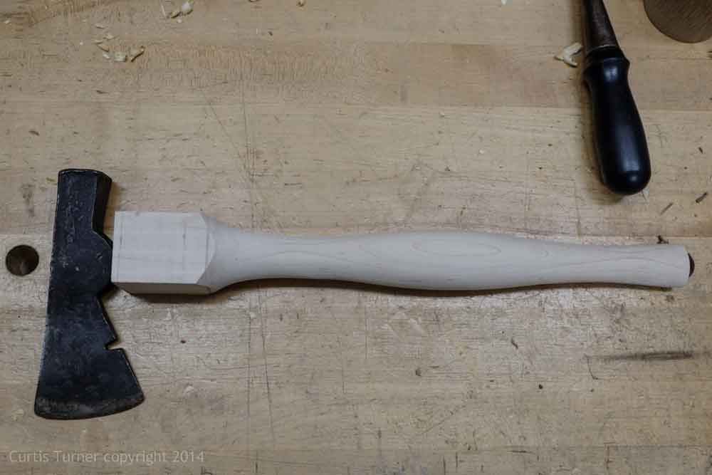 I mounted the blank on center then turned a portion down to round. I left a section square which will make in fitting the hatchet head easier. I used a large spindle roughing gouge to turn this handle. The mass of the larger gouge was better able to absorb the vibration from off-set turning.