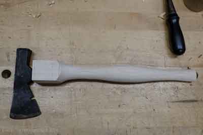 So what do the romantic notions of axes and hatches have to do with woodturning? Well, the lathe can be a practical way to make a replacement handle. Of course, you can buy replacement handles. This Kelly Works double bit axe was re-handled using a handle I purchased from Highland Woodworking.