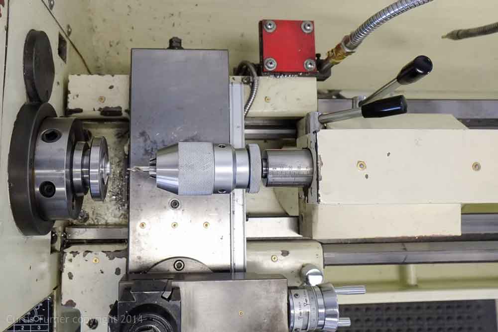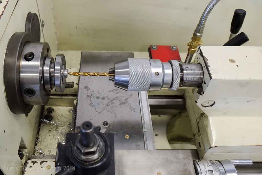 The piece was reverse mounted in the collet. Next the face was trued. Then I installed the keyless chuck in the tail stock. I used a pilot bit to drill a small starter hole:
