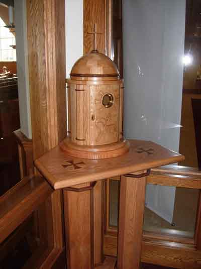 I have been doing woodworking for over twenty years. I started with my shop being a bench in the back of my garage. I eventually added on to the house, incorporating a 500 square foot shop behind the garage. In the last two years I have refocused my efforts on trying to refine my skills and produce higher quality pieces. Part of my problem has always been my tendency to find all of the faults in my work, so I build very little for myself. About a year and a half ago, I was asked to build a few custom pieces for my church. I found the projects challenging and I started pushing myself to learn something new with each piece. A fellow parishioner donated all of the wood for each project, and the church paid for any hardware or tools required to complete the job. Since I now had access to extra wood, I could experiment and grow. Sometimes the experiments failed, but usually the results were better than I had hoped. Most nights, I can be found down in my shop, usually working till midnight or later, if I am trying to get something done.
