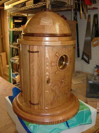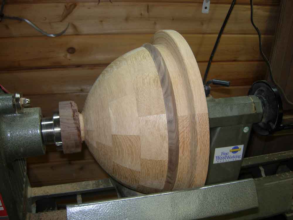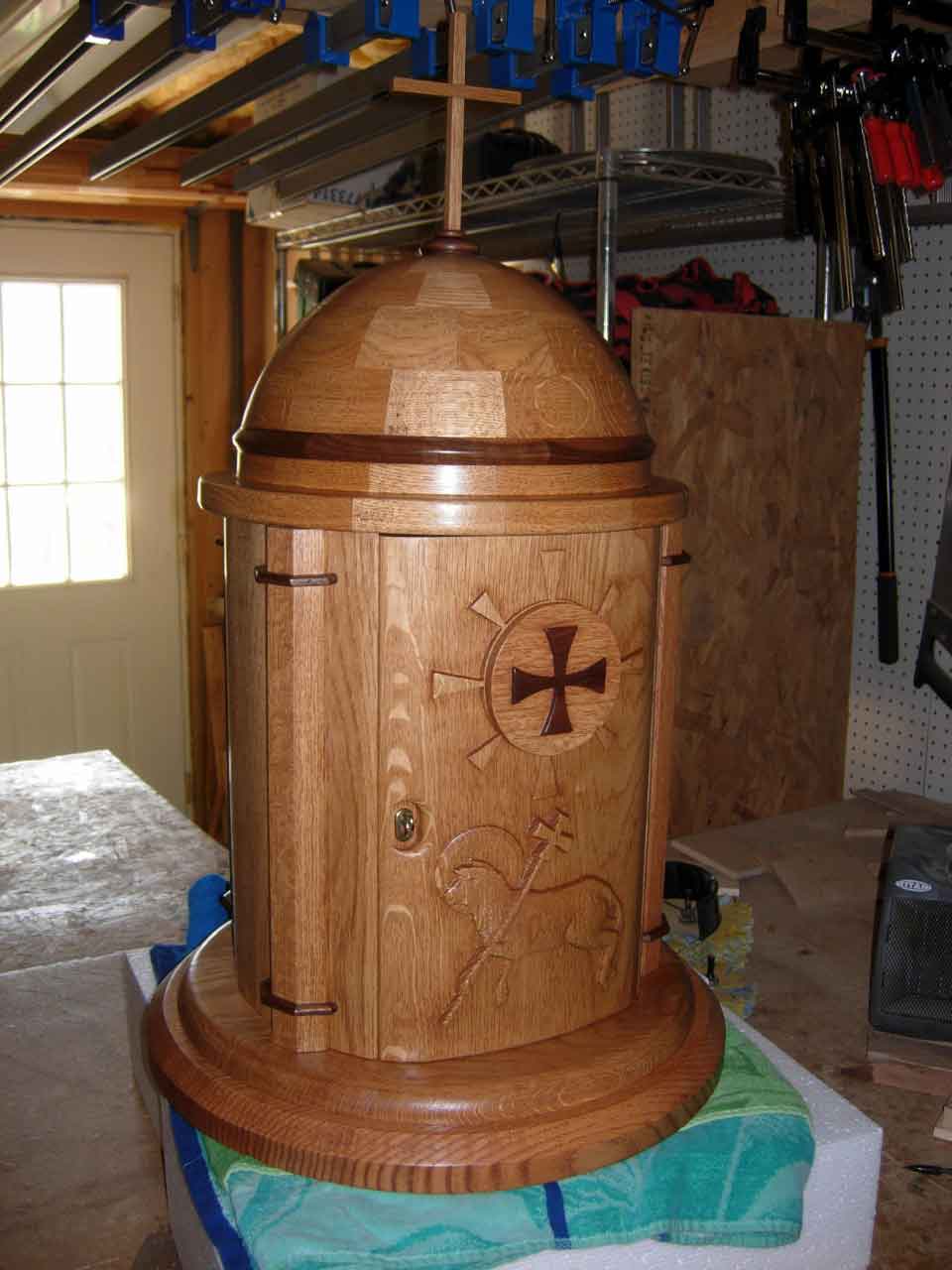 My last project for the church was a tabernacle. I really pushed myself on it, using nearly every tool I owned. I decided to make it round with a domed top. Until this project, I had only turned a few items on my lathe. The legs and crossbars for a couple or roorkhee chairs, and a few small bowls, made from some small, but pretty, chunks of walnut.