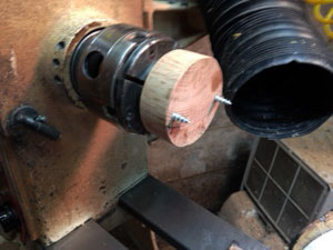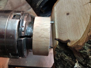 I took a piece of dry oak (any hard wood will do) and put a tenon on it and rounded it. Once in the chuck it stood out about an inch. I then drilled two pilot holes and counter-sinked. I used Spax screws because they are very strong and don't break easily. They have a serrated tip and move into the wood easily. Once pressure is applied from the live-center, they sink into the wood and hold fast.