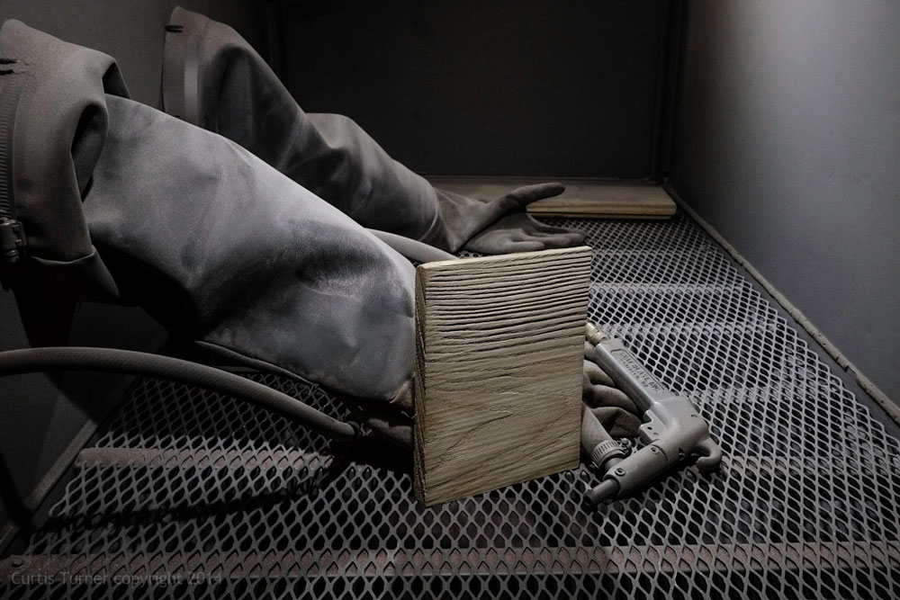 Sandblasting uses a course media forced under high pressure through a hand held nozzle. The media is sprayed against an object to remove surface imperfections such as old paint, surface rust or in our case the softer grain in the wood. I used this sandblasting booth to texture the bowls and other projects.