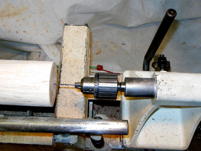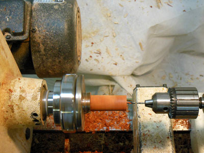 With a Jacobs chuck (drill chuck) in the tailstock of the lathe (Figure 10), I drill a 1/8 inch hole 1/2 inch deep in the center of the top of the body blank. This is for attaching the ornament blank.