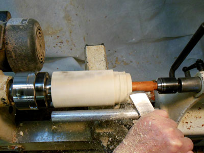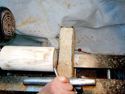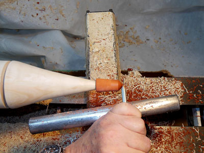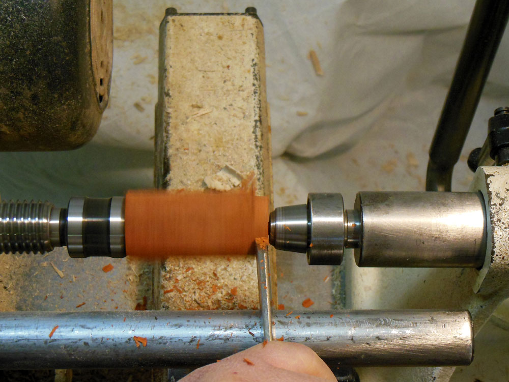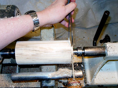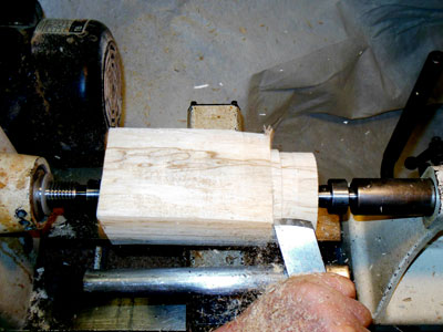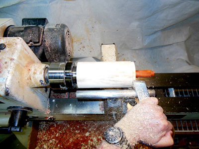 With the body blank still between centers, turn a tenon about a half inch long on one end (Figure 6).
