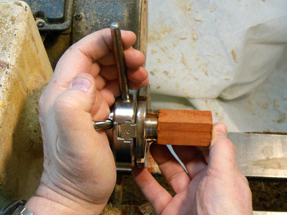 The small blank is then mounted in a woodturning chuck with small jaws (Figure 12), and the blank is roughed down to round (Figure 13).