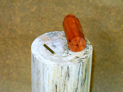 I glue the ornament blank on top of the body blank. For this tree, I use a 1/8 inch pin (a small length of brass rod that I had purchased for this and other uses) to reinforce the glue joint (Figure 15); that joint is end-grain to end-grain, and glue isn't strong enough by itself. A brass pin isn't really necessary; a nail with the head cut off will do fine.