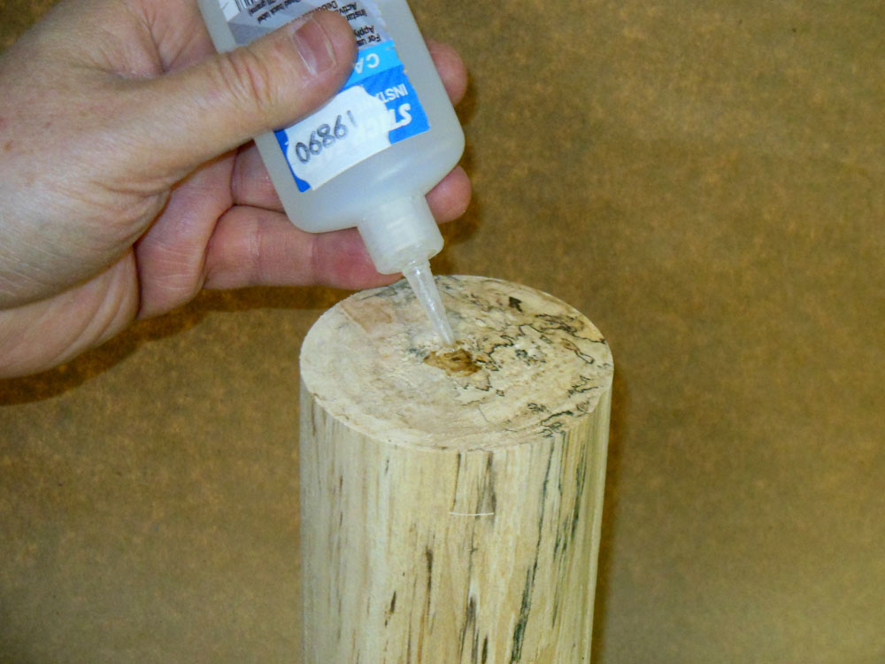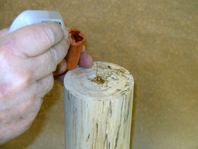 After putting glue on the end of the ornament blank (Figure 18), I push it onto the body blank pin (Figure 19), tapping it down for a tight fit (Figure 20). Clamping the two pieces together really isn't necessary, especially with CA glue; I give the glue joint a minute or so to set.