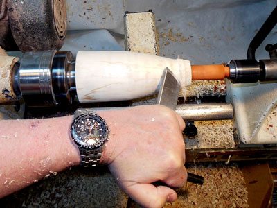 I then start on the base of the ornament, turning a ball shape (Figure 28 and 29), using a 1" skew.