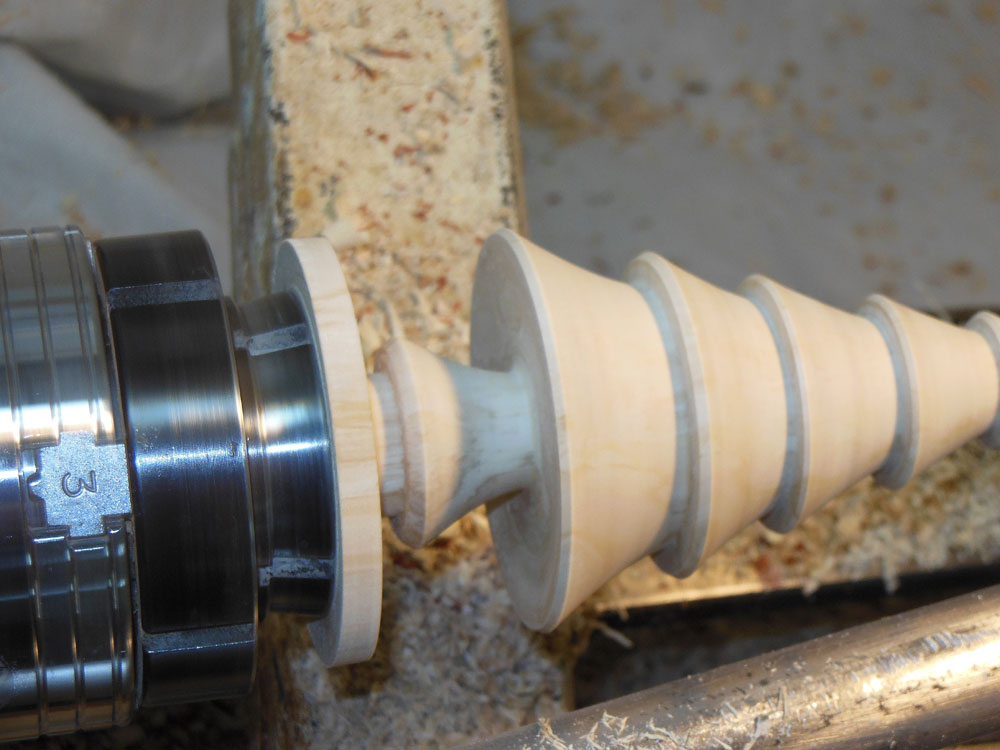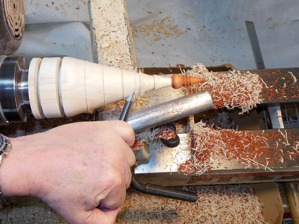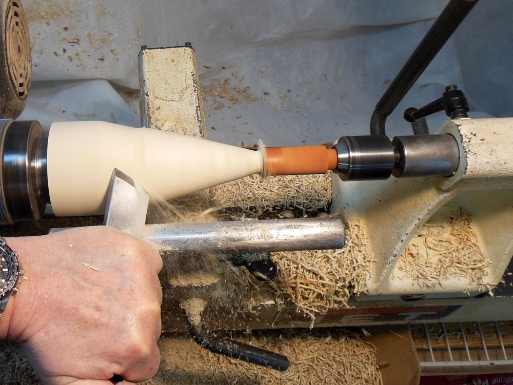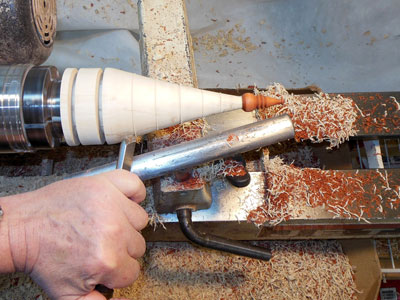 The blank is now remounted in a woodturning chuck with #2 jaws, and roughing out the conical Christmas tree shape begins (Figure 21).