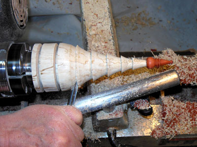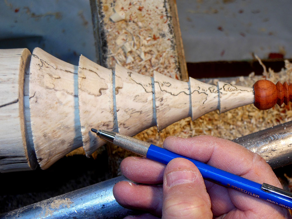 Note that the base of the cone is around 1-1/2" in from the left-hand edge of the blank; this leftmost length will be the tree trunk base. Although not strictly necessary at this point in time, I mark out the location of the tree base now (Figure 25); it makes it easier to visualize the entire tree shape. At the top of the body, right below the ornament joint, I leave the wood a little on the thick side, for strength while turning the ornament.