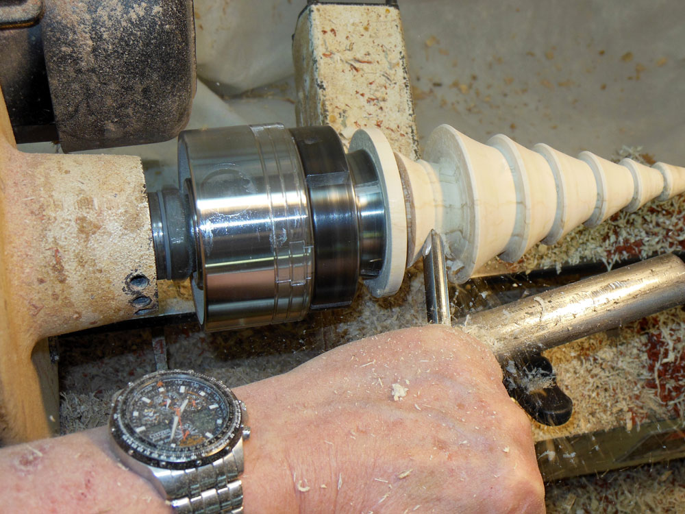 The body is done for the moment. I replace the woodturning chuck with a Steb-type drive center; the small blank for the ornament can split easily if a regular drive center is used. I find it easier and faster to use the Steb center rather than pre-drilling a center hold for a regular drive center.