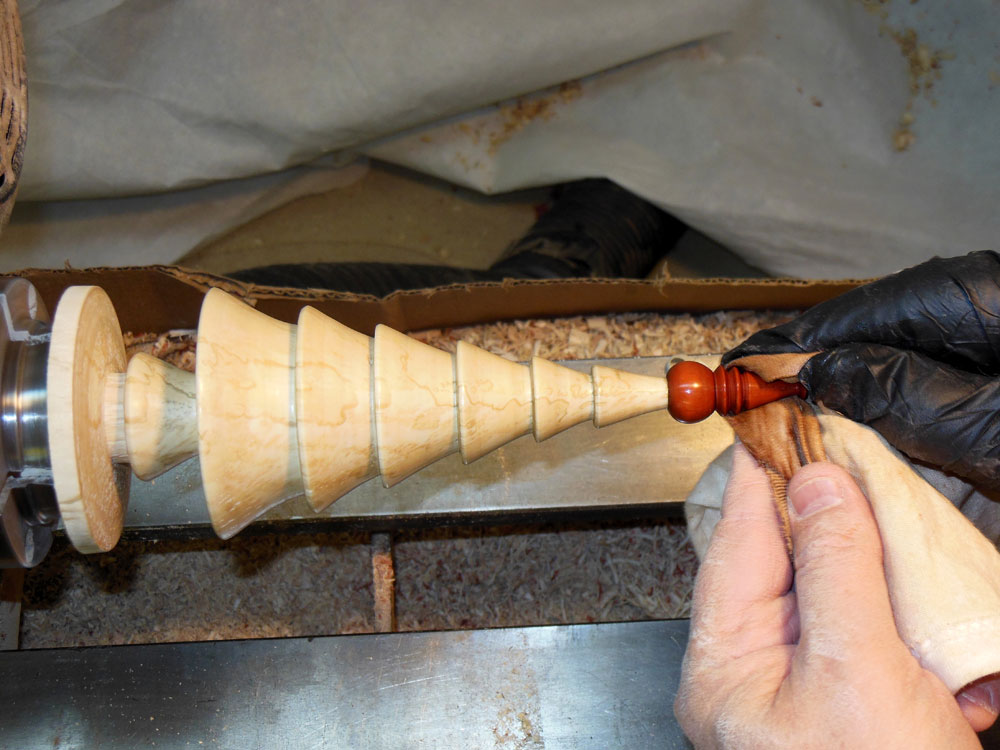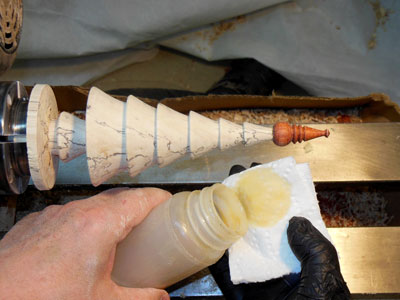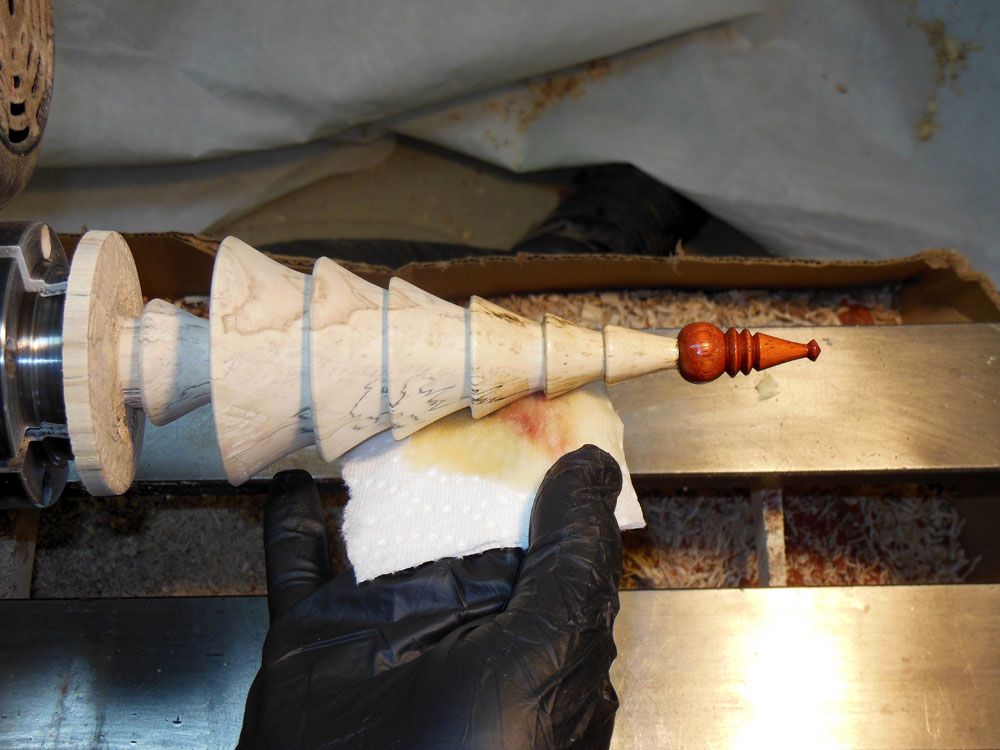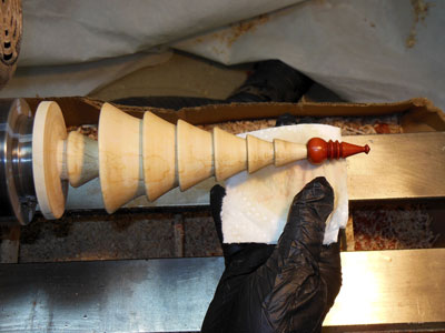 I wipe on the shellac with a paper towel with the lathe off, turning the piece by hand (Figure 43), and taking care to get the finish up into the edge right below each bough layer.