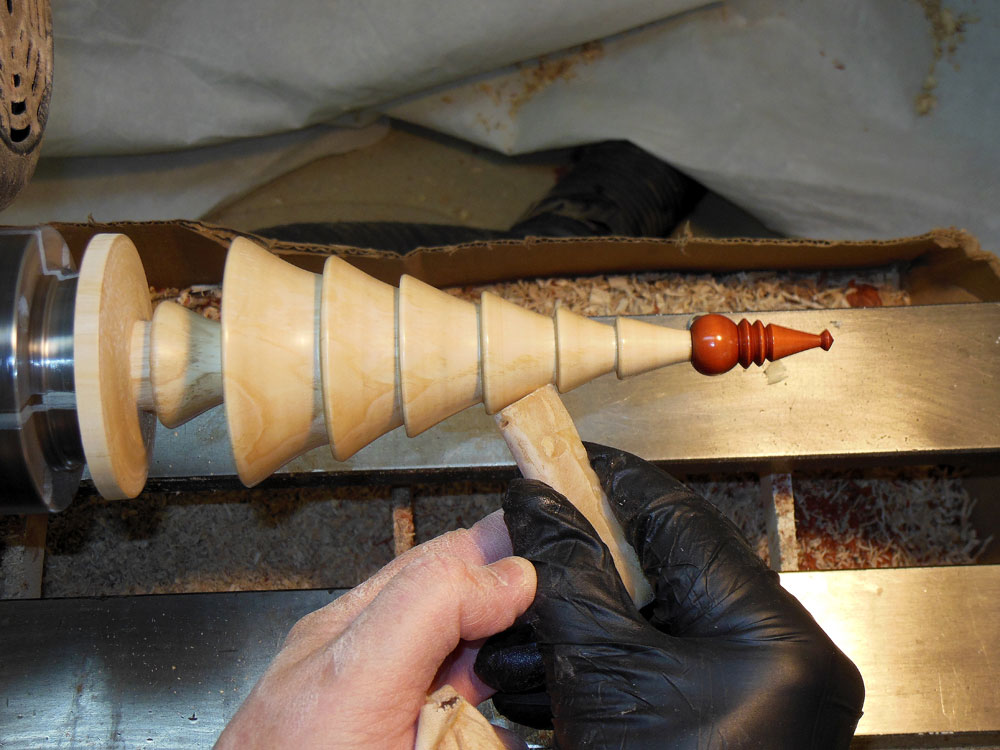 It's time to sand the tree…and sand….and sand…and sand. I start sanding at 150 grit and go down to 1000 grit (no pictures here, it's too boring). I use a friction polish (shellac) to finish the tree (Figure 42); the shellac has a few small chunks of carnuba wax added to it, but the wax doesn't dissolve, so the wax is pretty much to engage my imagination more than anything else.