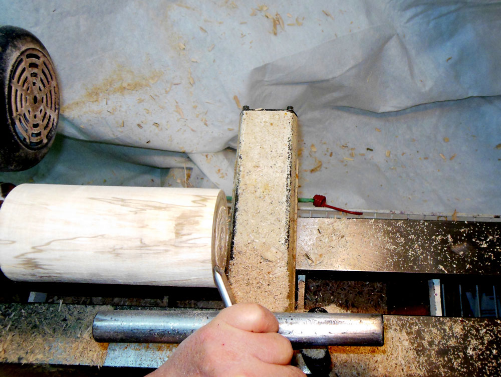 Next I mount the blank for the tree body and using a 1-1/2" skew, rough it down to round (Figure 4).