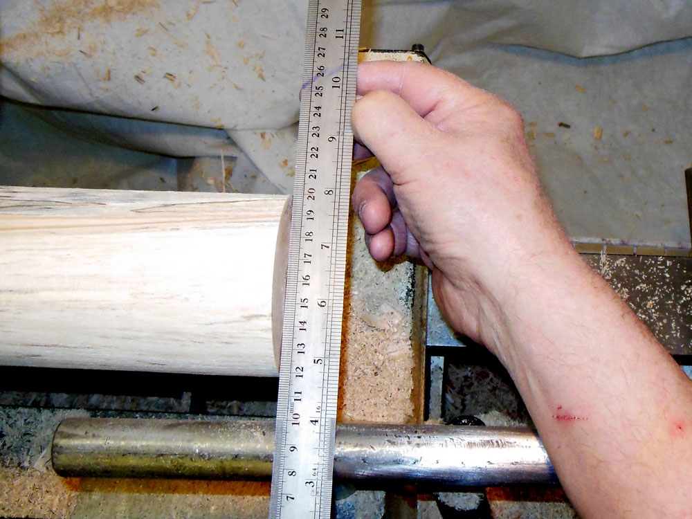 I start by cutting both pieces of the wood to length on a bandsaw. Then I mark the center on each end of the blanks, for mounting between centers (Figures 2 and 3).
