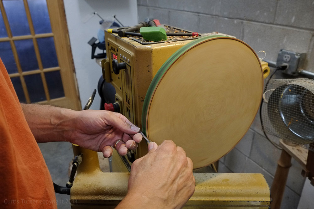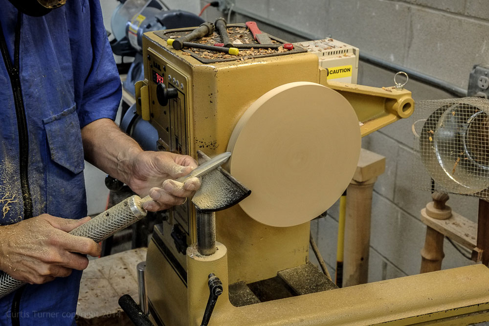 This is the fun part! I ran the wheel at about 150-200 RPM and carefully applied the knife edge to the rotating wheel. You can see the knife edge is pointing down towards the floor while the wheel is in forward rotation.