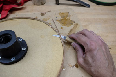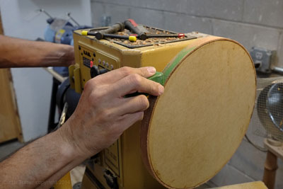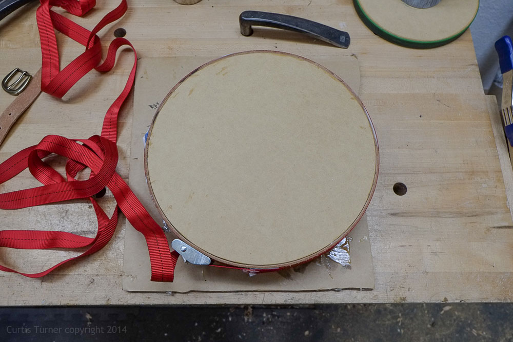 to attach the belt to the MDF disk. I spread a thin layer of glue on the wheel. Then I cinched a strap clamp around the disk (see photo below). I then sprayed on a small amount of accelerator to instantly cure the glue.
