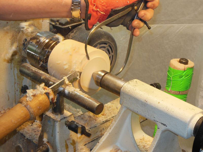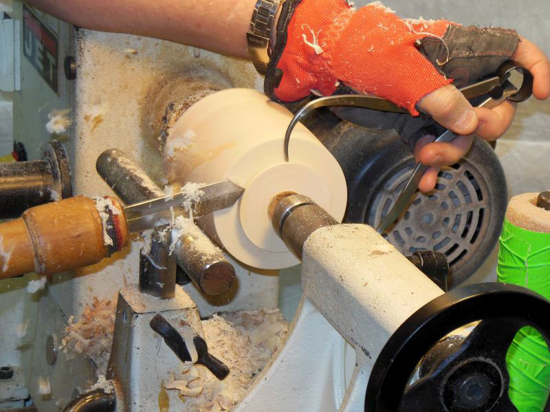 Now you can start turning the tenon to fit in the inner hole of the bandsaw table opening. (You should have this diameter already set on your second pair of calipers. Only one pair of calipers to work with? Change the setting on the first pair, you won't need it again unless you're turning multiple inserts.)