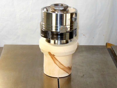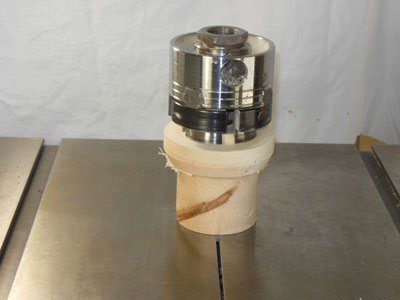 So, back to the lathe, screw the chuck onto the headstock again, and take a little more material off the tenon. Remove the chuck again, and go back to the bandsaw for another trial fit. Rinse and repeat, until you get to Figure #22, where the work piece fits snugly down into the lower opening and rests on the tenon shoulder. (Note that since the outer diameter of the work piece is turned slightly larger than the outer opening in the table, the work piece won't go down any further than the tenon shoulder.)