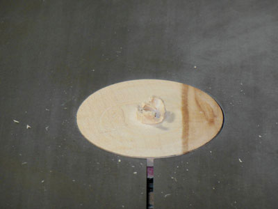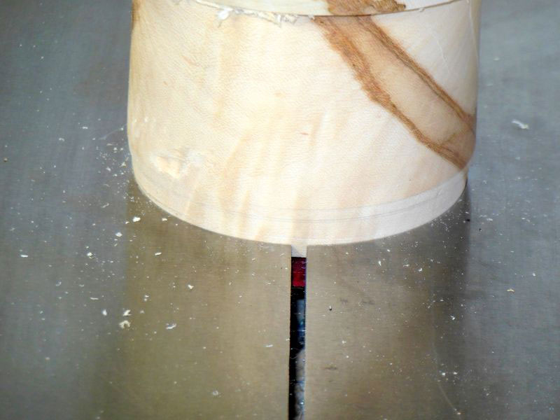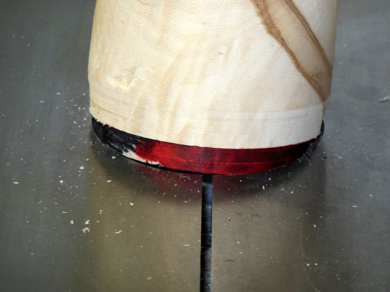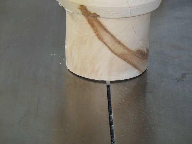 Back to the lathe, remount, and re-turn, and return to the bandsaw. When it's right, it will fit snugly (or perhaps sloppily – we'll address that later) into the table opening. It won't rock back and forth, or move sideways. It will feel stable.